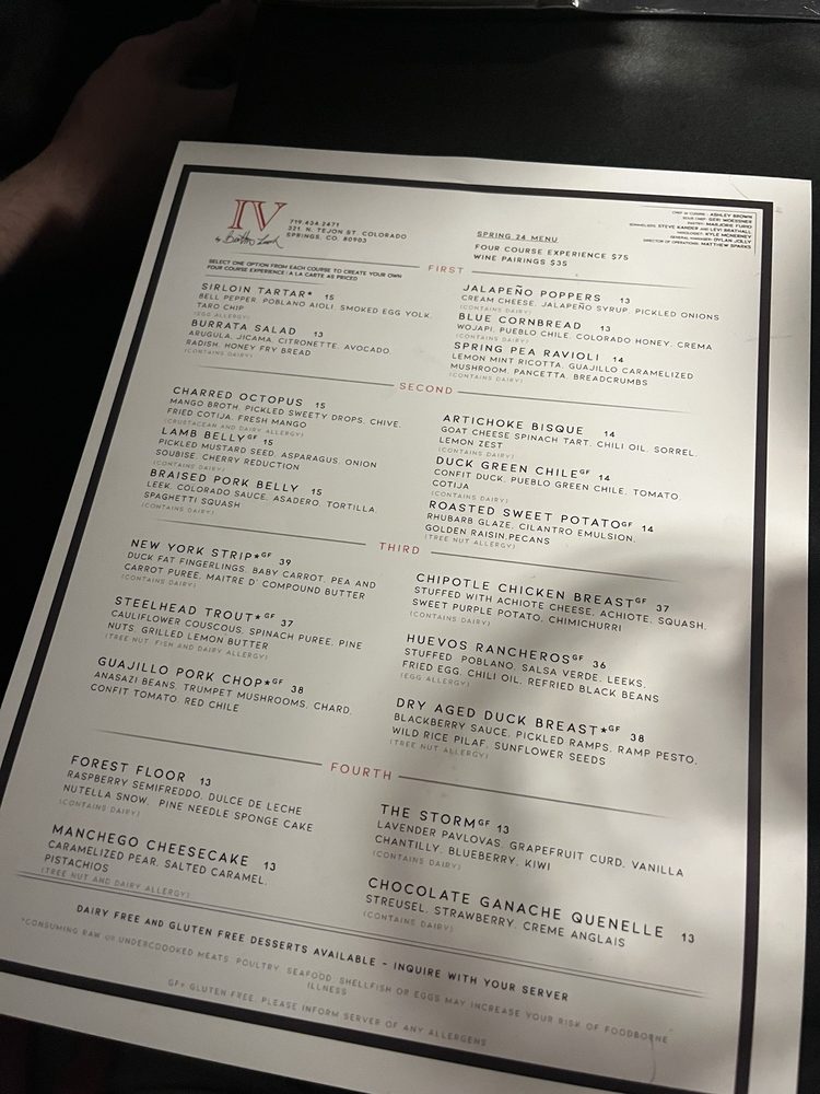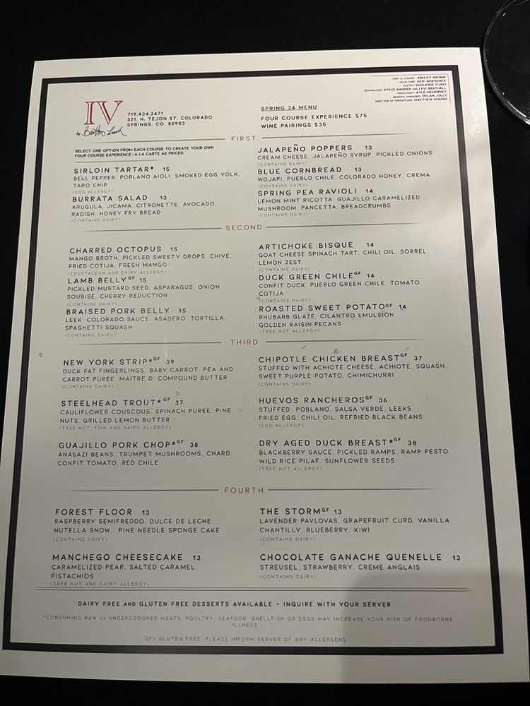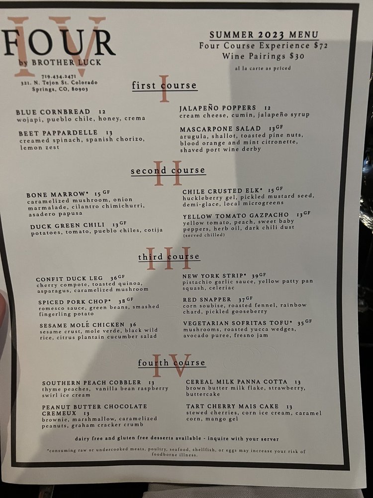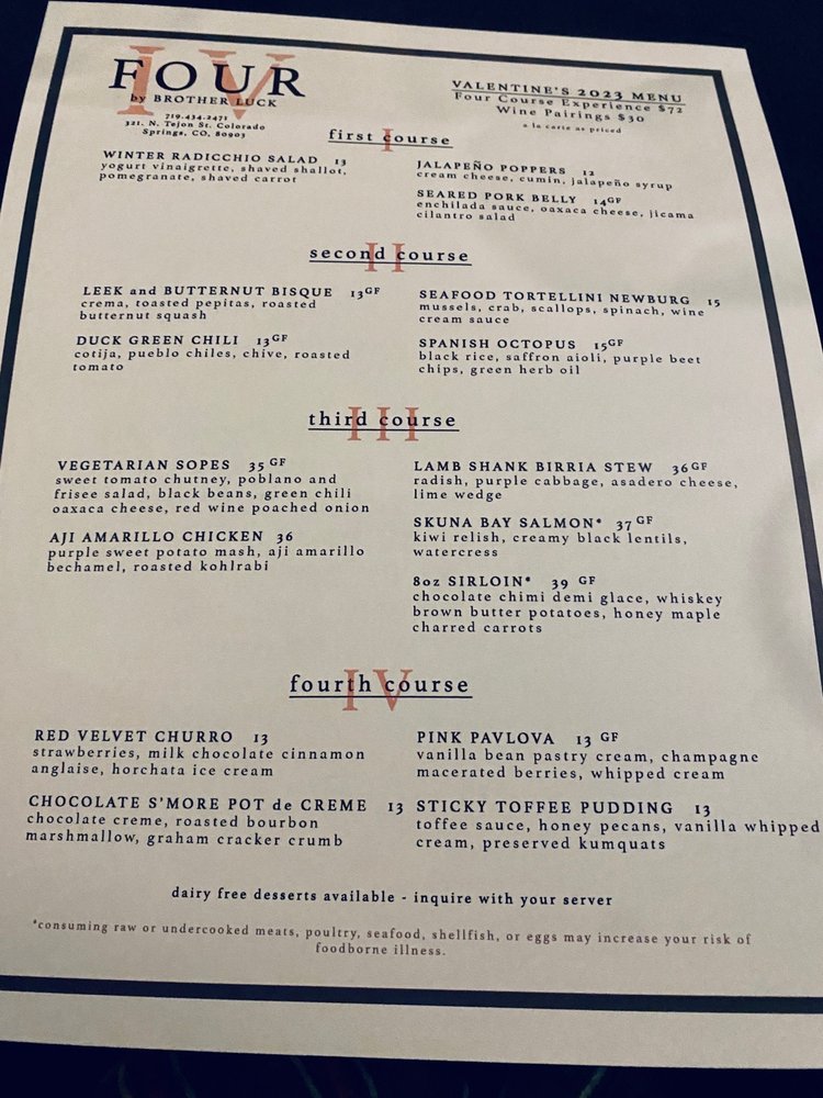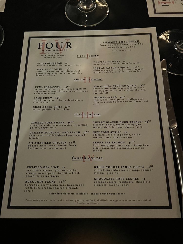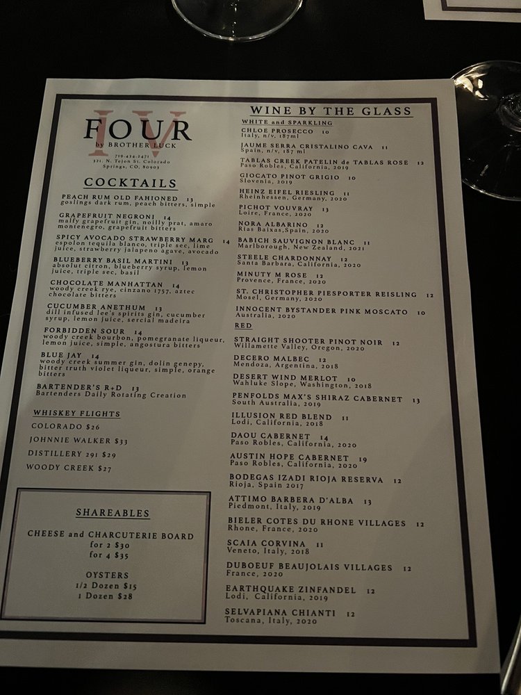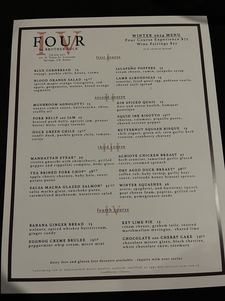 Introducing Four by Brother Luck, a Latin American and New American restaurant located in Colorado Springs. This upscale yet casual eatery offers a wide range of options including vegan and vegetarian choices. With a full bar, happy hour specials, and unique dishes like Serrano Jamon Toast and Spaghetti Squash, Four by Brother Luck is a must-visit for foodies and cocktail enthusiasts. The menu features starters like Blue Cornbread and Jalapeno Poppers, as well as brunch options such as Cast Iron Petite Pancakes. With a Black-owned establishment and a variety of amenities like outdoor seating, free Wi-Fi, and waiter service, Four by Brother Luck provides a memorable dining experience for everyone. Don't miss out on the chance to savor the flavors at this gem in downtown Colorado Springs.